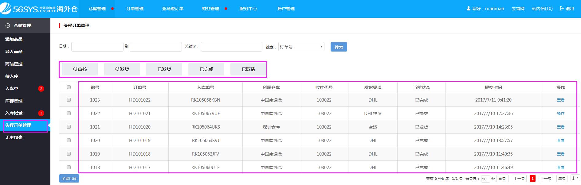 在“倉儲(chǔ)管理”——“頭程訂單管理”,列表查看所有“頭程訂單”的所有狀態(tài);