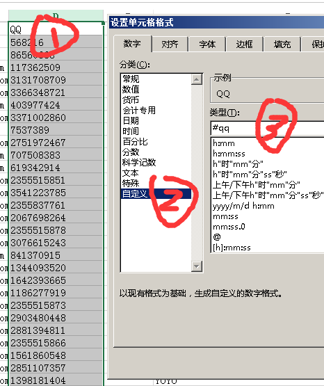 在QQ列里點(diǎn)右鍵,點(diǎn)設(shè)置單元格屬性,然后選擇自定義,類型這里輸入#qq,確定。