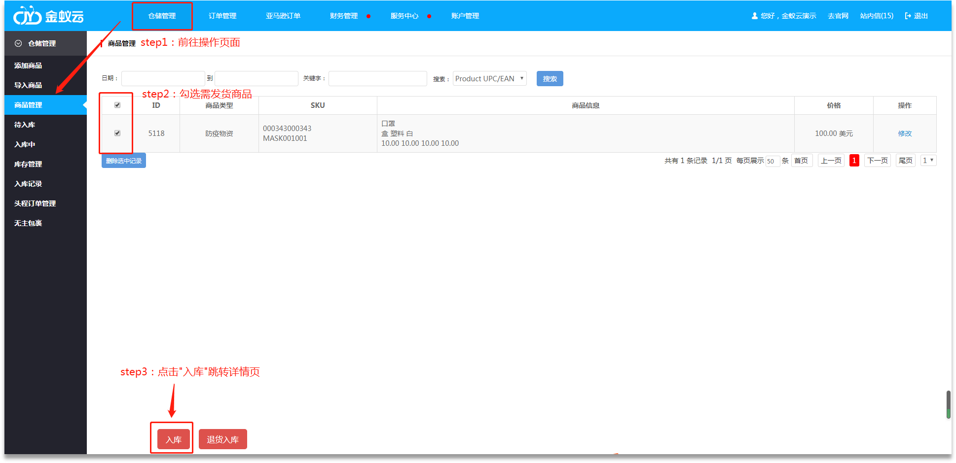 ·本系統(tǒng)支持頭程服務(wù),用戶可前往【倉儲管理】-【商品管理】,勾選商品后點(diǎn)擊【入庫】,跳轉(zhuǎn)【入庫操作】頁面。