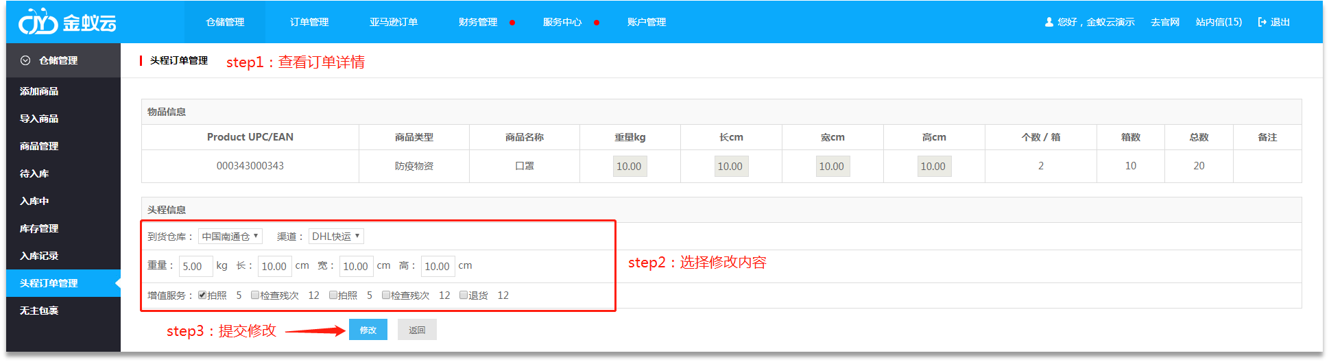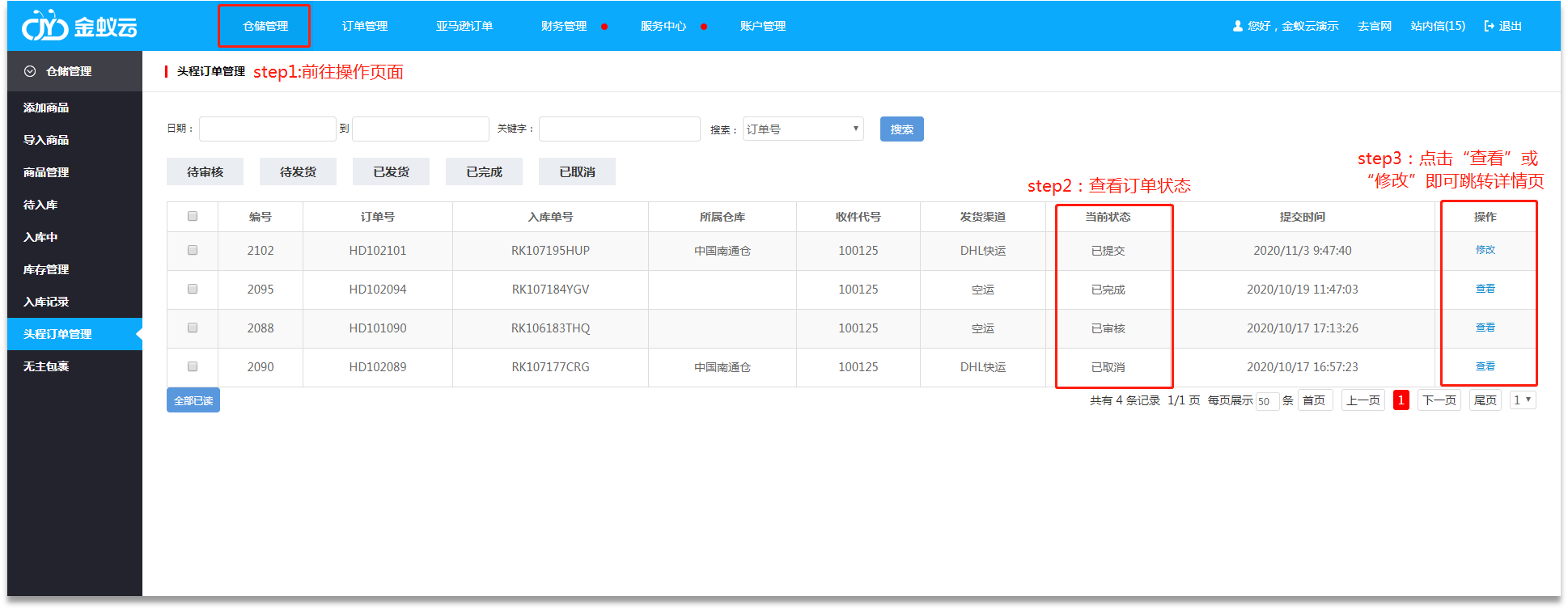 ·頭程服務(wù)提交成功后,用戶可在【倉儲(chǔ)管理】-【頭程訂單管理】進(jìn)行訂單查看或修改。