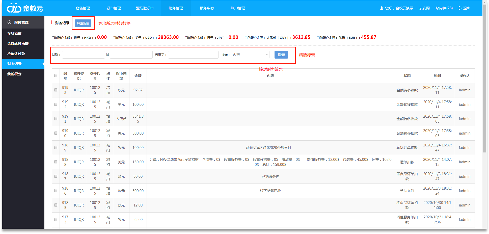海外倉(cāng)系統(tǒng)標(biāo)準(zhǔn)版(會(huì)員端)操作說(shuō)明:財(cái)務(wù)記錄