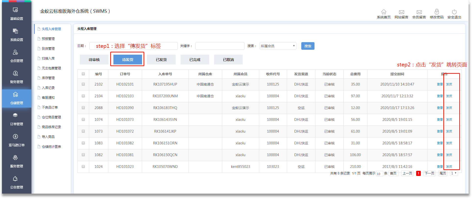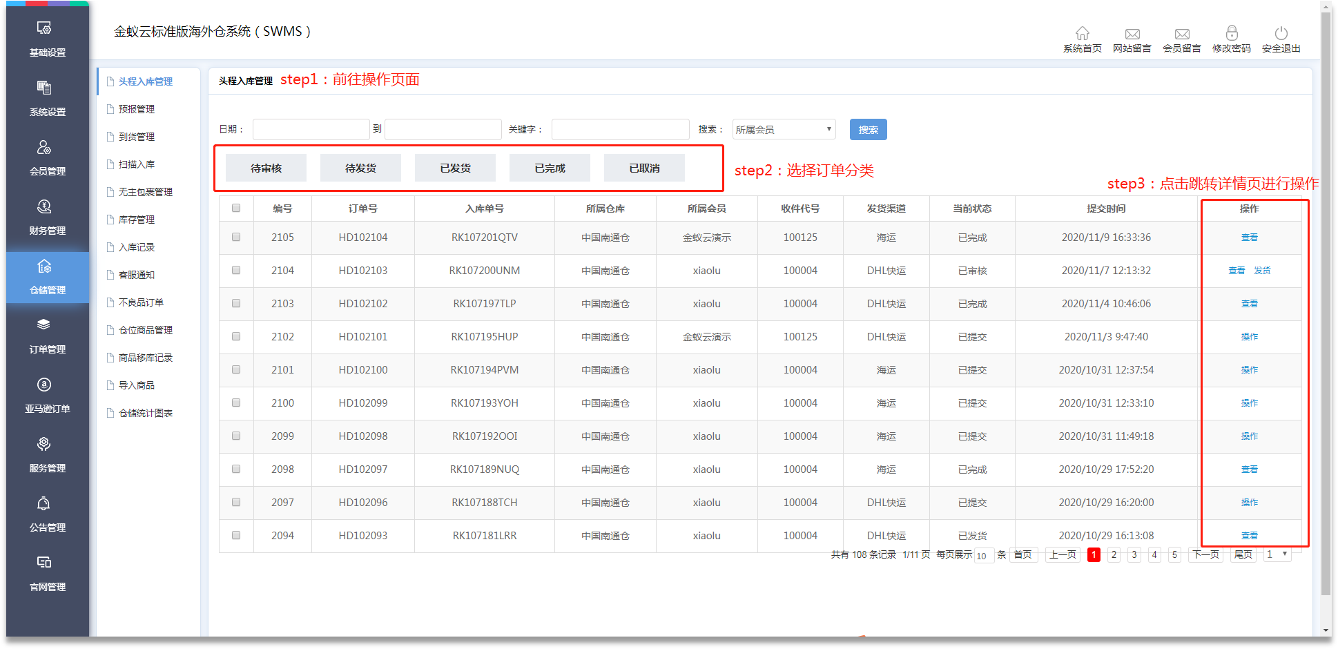 ·會員提交頭程訂單后,需在【倉儲管理】-【頭程入庫管理】進(jìn)行處理,管理員在待審核訂單處理可選擇提交/修改/取消。