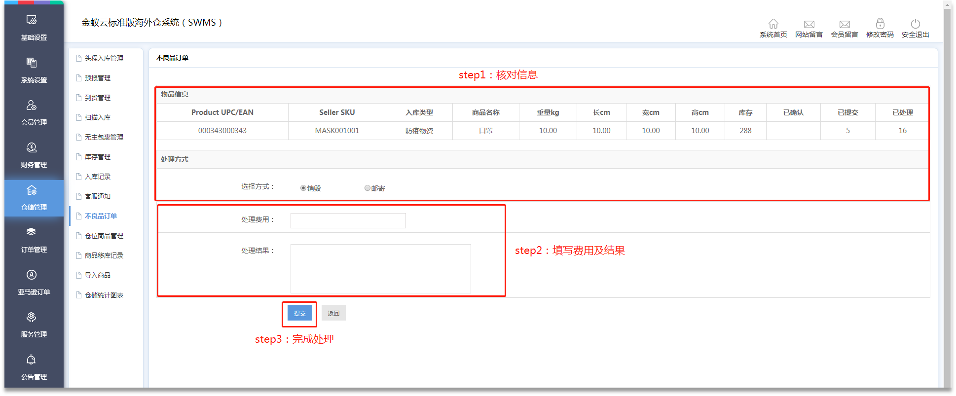 ·會員提交不良品處理訂單后,管理員需前往【倉儲管理】-【不良品訂單】頁面點擊【操作】,根據(jù)會員需求操作銷毀/寄回。