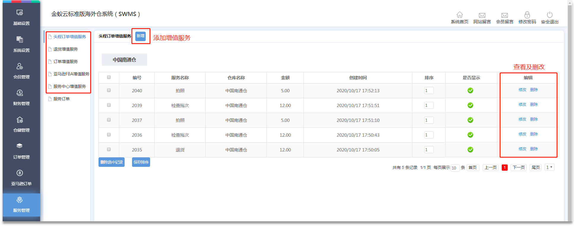 ·管理員可在【服務(wù)管理】板塊對【頭程訂單增值服務(wù)】、【退貨增值服務(wù)】、【訂單增值服務(wù)】、【亞馬遜FBA增值服務(wù)】、【服務(wù)中心增值服務(wù)】進行設(shè)置。