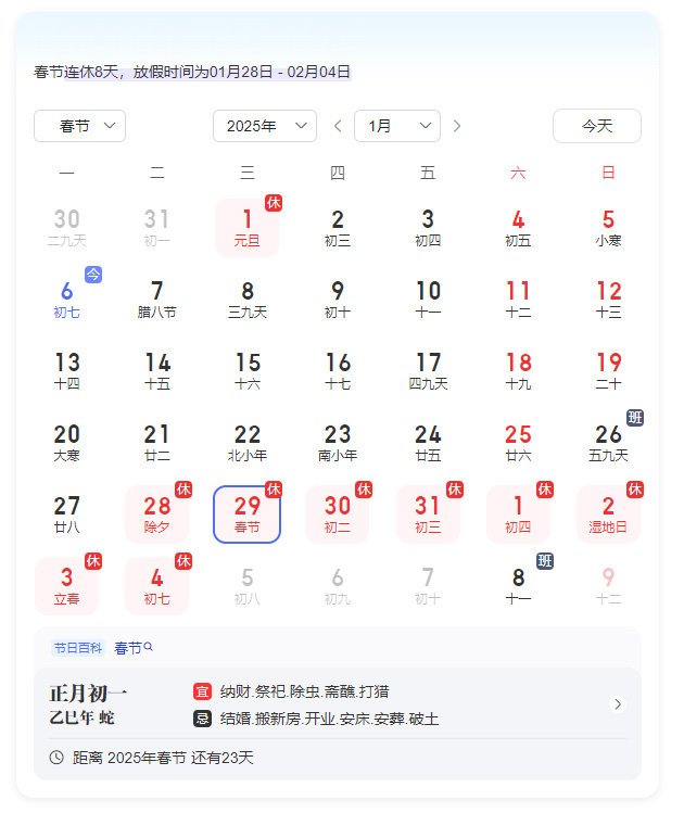 1月28日(除夕)至2月4日(初七)放假調(diào)休,共8天。