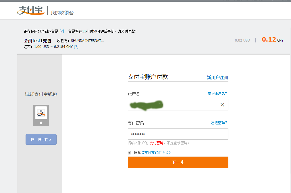 第1步: 登陸會員中心后,在在線充值頁面的 海外支付寶充值的金額里輸入要充的金額, 以下為充值0.12元舉例.