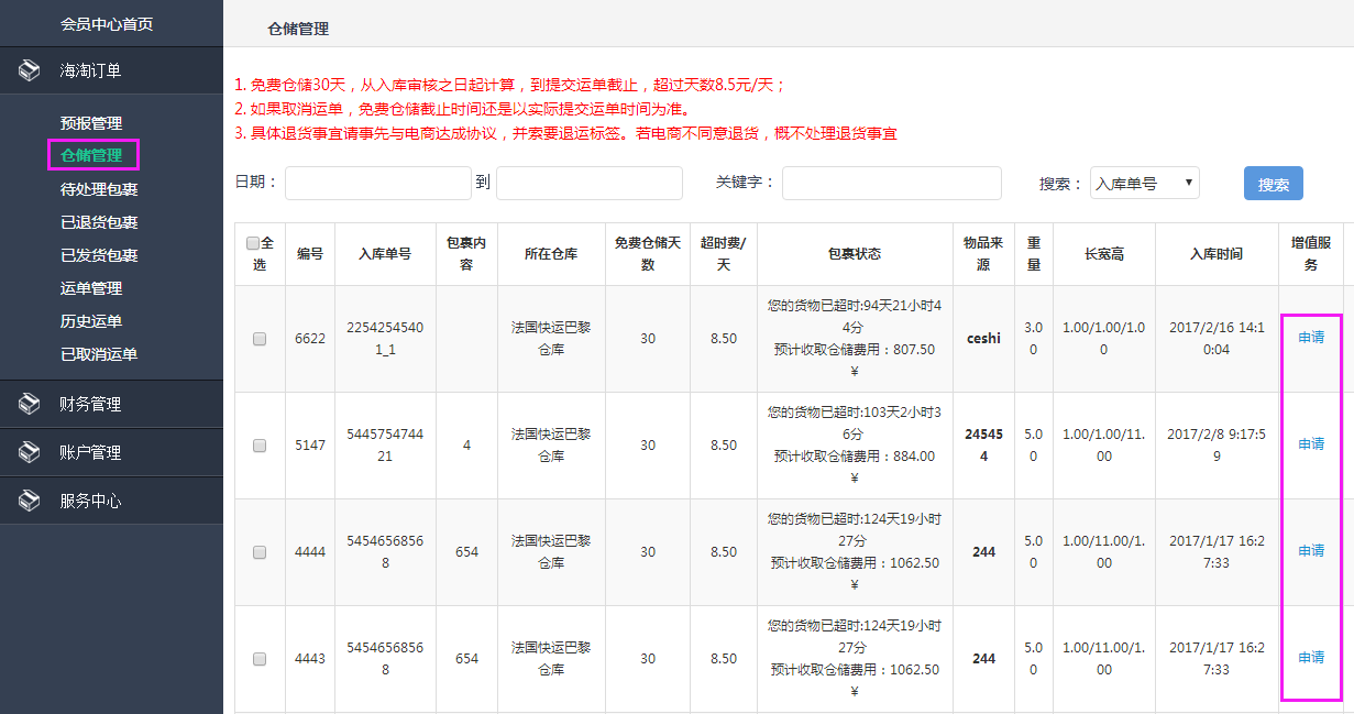 結(jié)合海淘轉(zhuǎn)運(yùn)實(shí)際情況,此功能主要用于倉庫收到包裹后,客戶(會(huì)員)可對(duì)已經(jīng)入庫還未發(fā)貨的包裹,提交增值服務(wù)申請(qǐng);