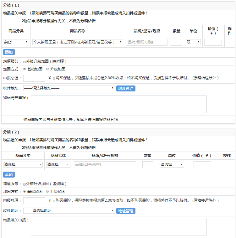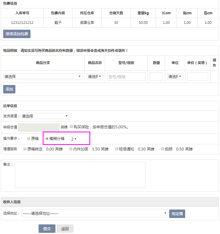 精確分箱:對(duì)單個(gè)包裹進(jìn)行分箱,可選擇不同收件人,填寫不同的物品信息;