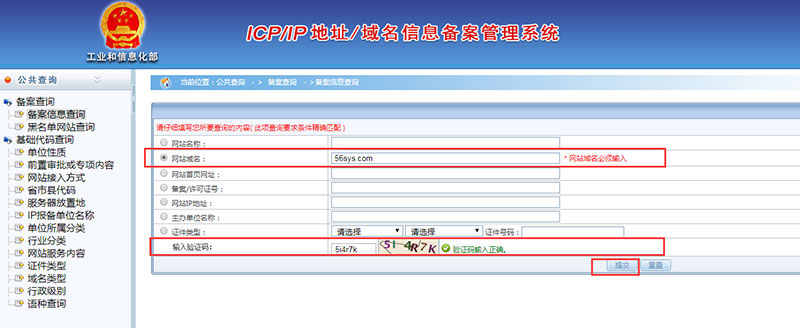 2、在備案信息查詢頁面,輸入網(wǎng)站域名及驗證驗,點擊“提交”按鈕。